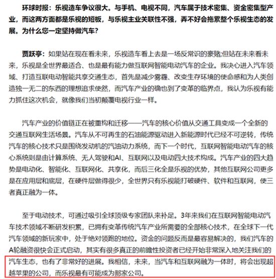 2017年3月,贾跃亭在接受媒体采访时表示,汽车产业的四大趋势是电动化、智能化、互联网化、共享化,而后三化全是乐视优势。“我相信,未来,当汽车和互联网融为一体时,将会出现超越苹果的公司,而乐视最有可能成为那家公司。”