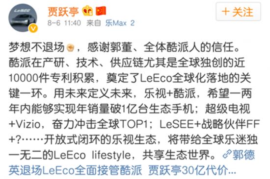 2016年8月,贾跃亭在正式入主酷派后,一言不合又立下新Flag,称希望乐视+酷派一两年内能够实现年销量破1亿台生态手机。换言之,最晚到2018年8月,乐视+酷派年出货量将达到1亿台,野心勃勃可见一斑。