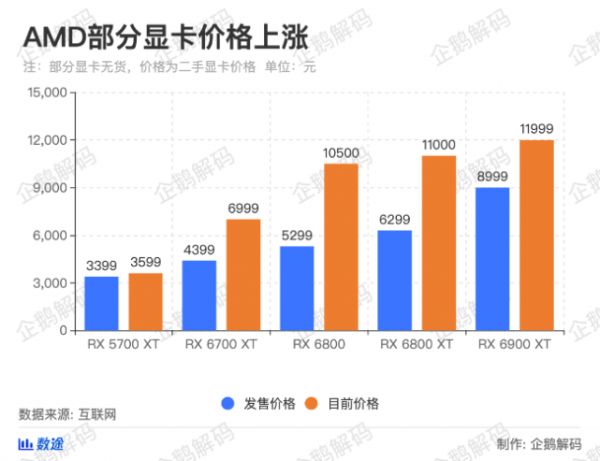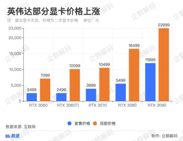 英伟达的显卡RTX 3060 Ti和RTX 3080涨价尤为明显,RTX 3060 Ti从2499元上涨到10099元、RTX 30805499元上涨到16499元,分别是原价的404%和300%。而AMD的RX 6800的价格也从5299元上涨到10500元,接近翻倍。