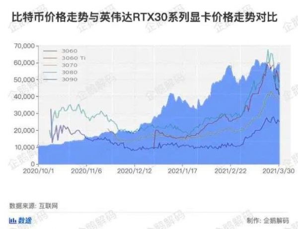结合上图从2020年10月份开始的比特币价格和英伟达RTX 30系列显卡的价格走势可以看出,两者的走势基本一致。这也就意味着,比特币价格的上涨在一定程度上刺激了显卡价格的上周。
