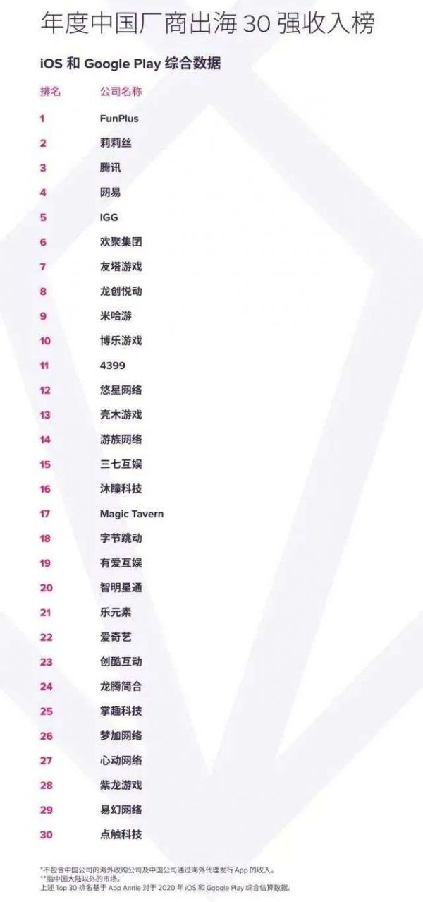 另根据APP ANNIE发布的2020年度中国厂商出海30强收入榜单,FUNPLUS稳居榜首;莉莉丝则凭借《剑与远征》和《万国觉醒》两款头部产品,将自身排名拉至第二位;仅次于腾讯、网易的IGG回港上市后,2020年净利润达到17.6亿元以上。