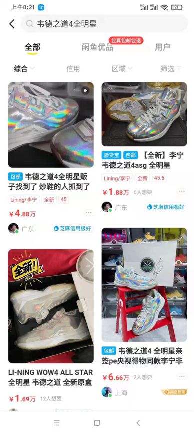 在“闲鱼”上,懂懂笔记仍看到有用户在出售韦德之道4全明星银白款,价格均在一万五左右。玮铭说,群里有加价入手同款球鞋的人在“闲鱼”上卖,仅仅是为了挽回损失,能否快速出手也全看运气。