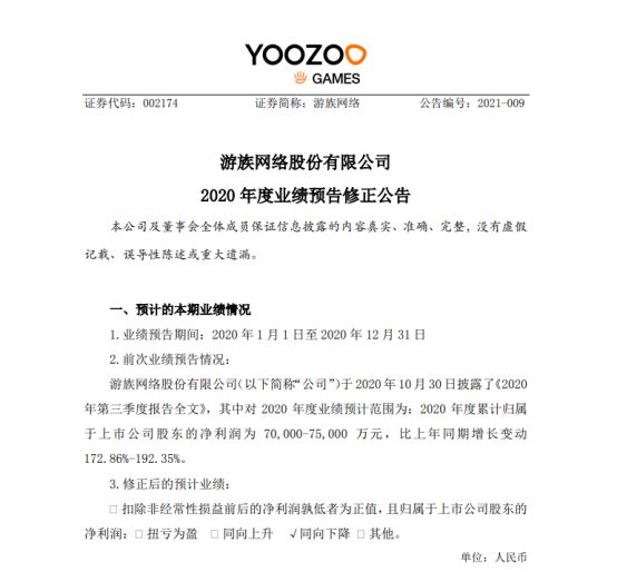 不过,2021年1月29日晚间,游族网络又发布《2020年度业绩预告修正公告》,大幅下修了此前2020年10月30日三季报中对于年度业绩的预计范围,预计2020年盈利1.5亿元至2.25亿元,同比下降12.29%-41.53%,而此前预盈7亿元至7.5亿元,盈利大幅下降。