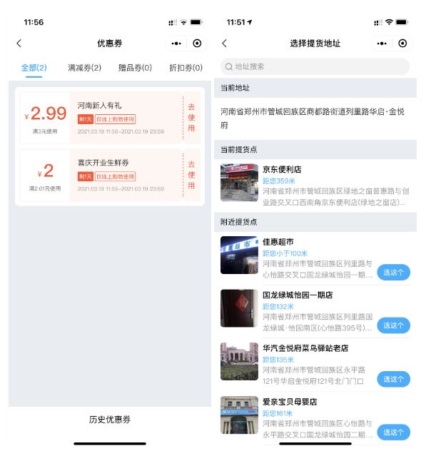 亿邦动力测试发现,将地址切换至郑州的不同地区,均能看到周围约20个提货点,其中还不乏京东便利店,可见其覆盖速度之快。