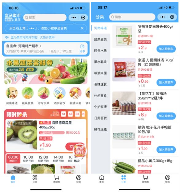 盒马集市目前是标准的社区团购玩法,依靠团长分享推荐商品给消费者,并完成整个交付。在河南(郑州)当地键入盒马集市小程序,可以看到丰富的新人优惠券、限时当天的红包等,首页包括商品分类、限时秒杀和部分折扣限购商品列表。