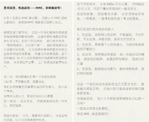 日前,阿里首次通过公开信的形式回应了对MMC的定义:“服务每家店,只为每个家。”具体做法是,专注小店数字化升级,让小店拥有更强的数字化能力去服务周边的消费者,邻里之间更有温度。让日均触达10亿人次的网络对消费需求形成即时洞察,从而实现产业带、工厂和农业的数字化生产。