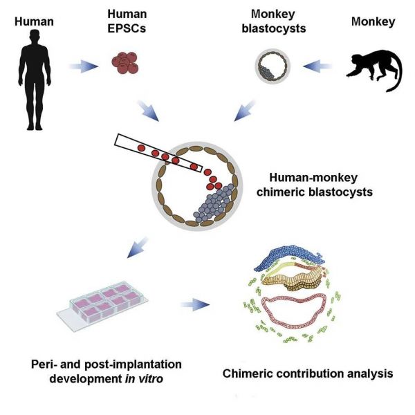 简单来说,就是将具有高分化能力的人类多能干细胞注射到猴子的囊胚中,然后在体外进行培养。研究人员发现,多能干细胞不但能够在猴胚胎中生长,而且还能整合到猴胚胎的组织发育中。