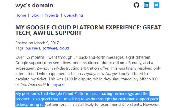 一位用户如此评价谷歌云:技术很好,客服很渣:”它的技术是如此好,以至于我愿意忍受客服方面的痛苦而继续使用它“——只是长此以往下去,不知道谷歌云还能留下多少这样忠诚的客户。