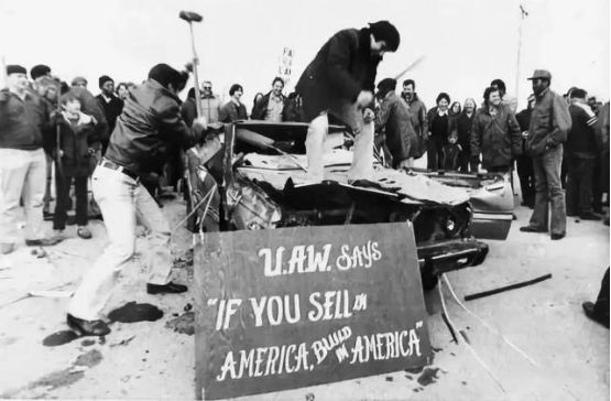1981年3月,一场反对购买外国制造产品的集会活动中,美国联合汽车工人协会(UAW)会员砸毁一辆丰田轿车。图:AP/Str Photo