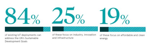 更进一步的分析显示,绝大多数的物联网项目都与碳中和的目标一致。84%的物联网项目可以满足全球性的可持续发展,在这些项目中,25%关注于工业和基础设施创新,19%聚焦于提供价格合理的清洁能源。