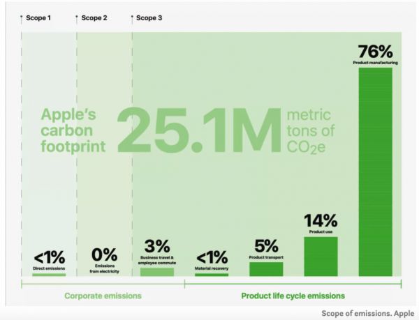 比如在苹果披露的碳足迹中,产品生产过程中的碳排放最多,占比76%。其次是产品使用和产品运输中的碳排放,分别占14%和5%。
