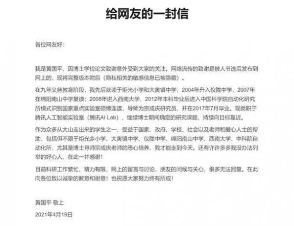 在博士论文的致谢部分中,他黄国平细数了发生在自己家庭中的种种不幸,年幼时母亲离家,十七岁时经历了父亲和婆婆的相继离世等等。但从小学一直到大学,再到中科院自动化所,黄国平怀揣的信念是,“把书念下去,然后走出去,不枉活一世”。
