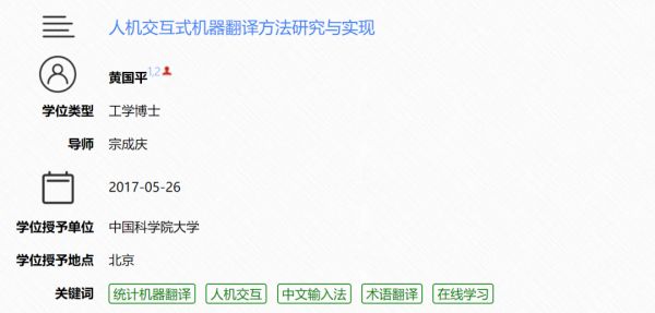 这篇论文题为《人机交互式机器翻译方法研究与实现》,撰写这篇博士论文的是2017年毕业于中国科学院大学的工学博士黄国平。