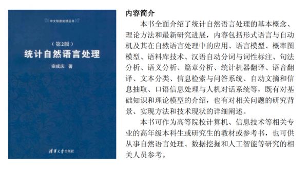 在国内机器翻译领域,不说别的,宗成庆翻译的Philipp Koehn的《统计机器翻译》当属国内中文第一本SMT的书,同时《统计自然语言处理》可以称得上是几乎所有自然语言处理者的入门教材,可见其地位之高。