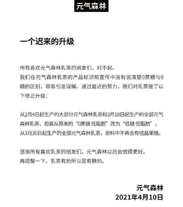 4月10日,元气森林在官博等渠道发了一份“迟来的升级”,因元气森林乳茶产品标识和宣传中,没有说清楚0蔗糖和0糖的区别,容易引发误解,对乳茶包装标签和配料做了修正升级。