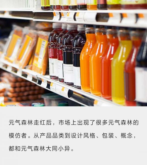 元气森林走红后,市场上出现了很多元气森林的模仿者。从产品品类到设计风格、包装、概念,都和元气森林大同小异。