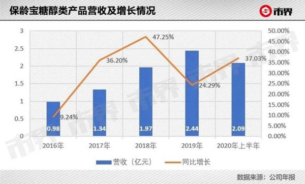保龄宝是元气森林赤藓糖醇的供应商。2016年,元气森林刚刚成立,当时市场上的无糖饮料还不火,保龄宝糖醇类产品的营收为0.98亿元。