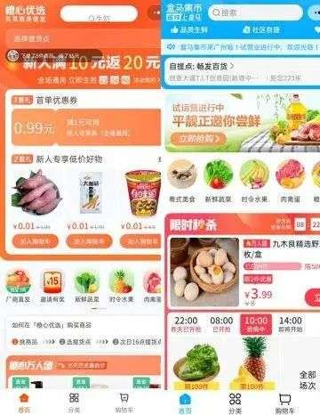 橙心优选和盒马集市小程序界面对比