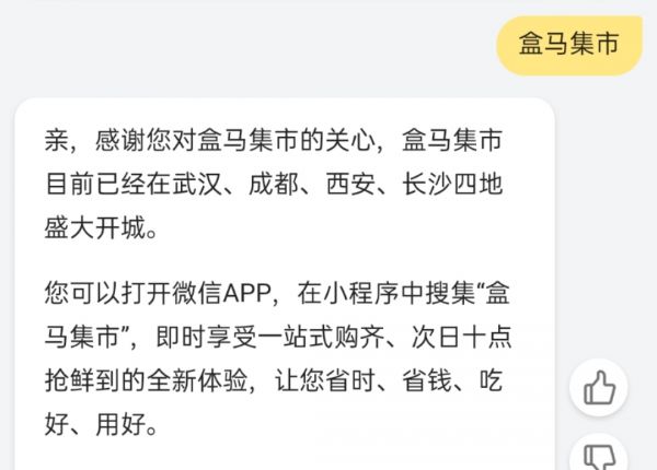 知晓程序通过客服询问「盒马集市」,也得到了需前往微信小程序搜索「盒马集市」 的自动回复。