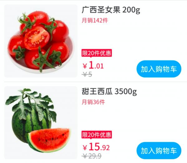商品方面,盒马集市首页的多件蔬果商品被打上优惠价格。当天下单,第二天即可到自提点自提。
