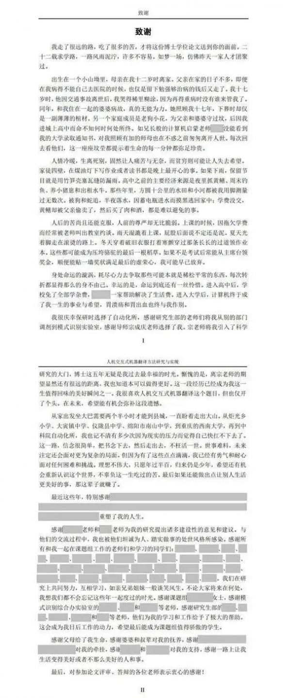 该篇致谢来自论文《人机交互式机器翻译方法研究与实现》,作者是2017年毕业于中国科学院大学的工学博士黄国平。作者在致谢中回顾了自己如何与命运抗争的故事,字字句句讲述着一位普通人受尽磨难却依然温柔、历尽千帆归来仍少年的人生历程,看哭了千万网友。