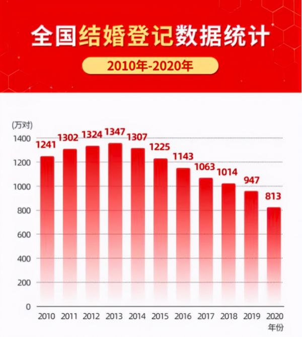 2020年3月,民政部公开数据显示,国内全国结婚登记数据从2013年的1347万对,逐年下降到了2020年的813万对,降幅约39.64%。