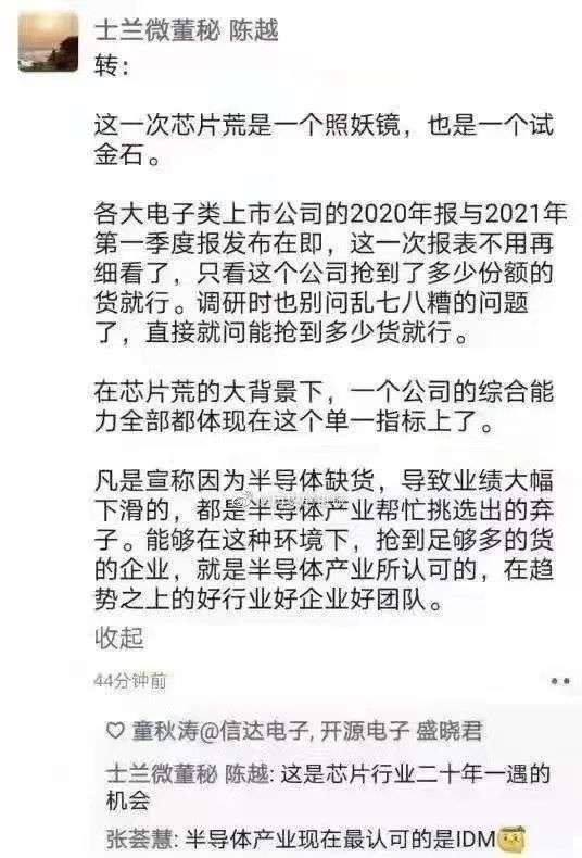 值得一提的是,3月31日,我国半导体企业士兰微的董秘陈越在朋友圈转发的一段文字被网友截图上传网络,随即引发关注,文字内容称:“这一次芯片荒是一个照妖镜,也是一个试金石。各大电子类上市公司的2020年报与2021年第一季度报发布在即,这一次报表不用再细看了,只看这个公司抢到了多少份额的货就行。调研时也别问乱七八糟的问题了,直接就问能抢到多少货就行。在芯片荒的大背景下,一个公司的综合能力全部都体现在这个单一指标上了。”