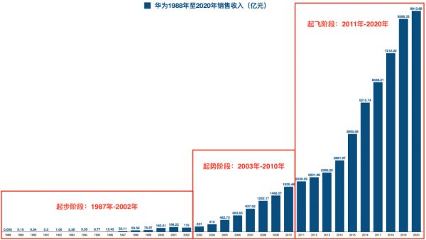 华为自1987年成立至今34年,如果依照年收入规模,大致可以划分为三个阶段——起步、起势、起飞。