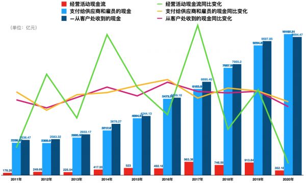 2011年至2019年,华为一直是进来的钱比出去的多,但到了2020年,华为支付给供应商和雇员的现金为10102.31亿元,比从客户处收到的现金多了207.84亿元。