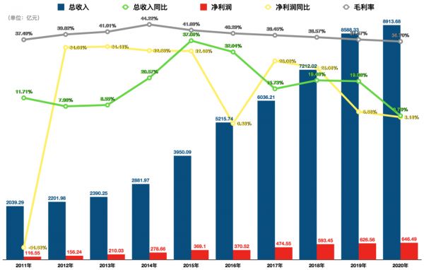 起飞:2011年到2020年,华为年收入从2039.29亿元增长至8913.68亿元。