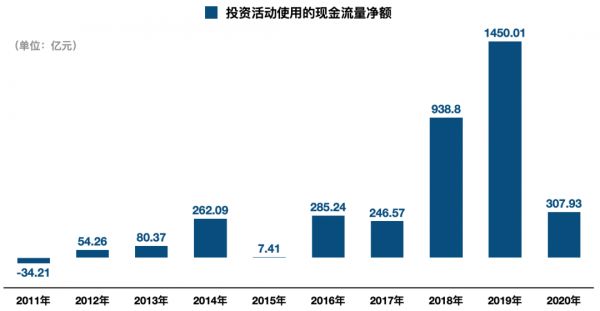 近十年来,华为的经营活动现金流起伏较大,差不多是一年增加次年就会减少,整体规模是上升的,但2020年出现了异常。