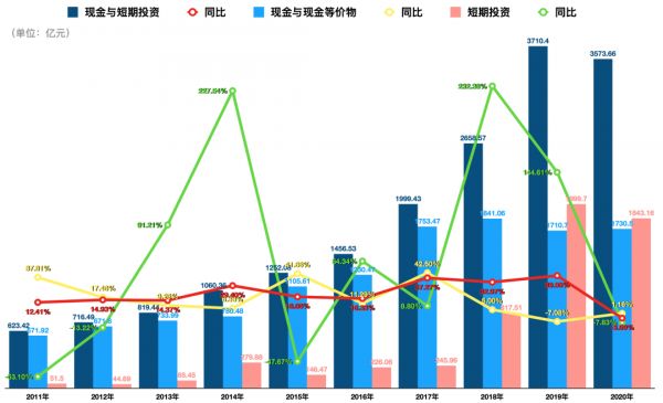 2018年,短期投资同比增加232%,2019年同比又翻了一倍多,超过了现金与现金等价物的规模。截至2020年末,短期投资略微下降至1843.16亿元,现金与现金等价物为1730.5亿元。
