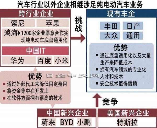 汽油车事实上的竞争对手只有日美欧韩的十大车企。而在纯电动汽车方面,美国苹果据称将涉足,全球最大的电子产品代工企业台湾鸿海精密工业也决定建立工厂。另外,中国正在作为国策强化纯电动汽车相关产业,大型IT企业及新兴企业接二连三的涉足。