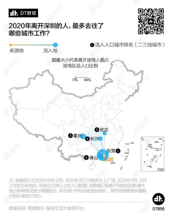 DT君特别注意到了广州和深圳。人们从这两座城市离开之后,选择都大同小异。离开广州选择了二三线城市的朋友中,有4成奔向了佛山;离开深圳的人口中,有超过4成选择了东莞。