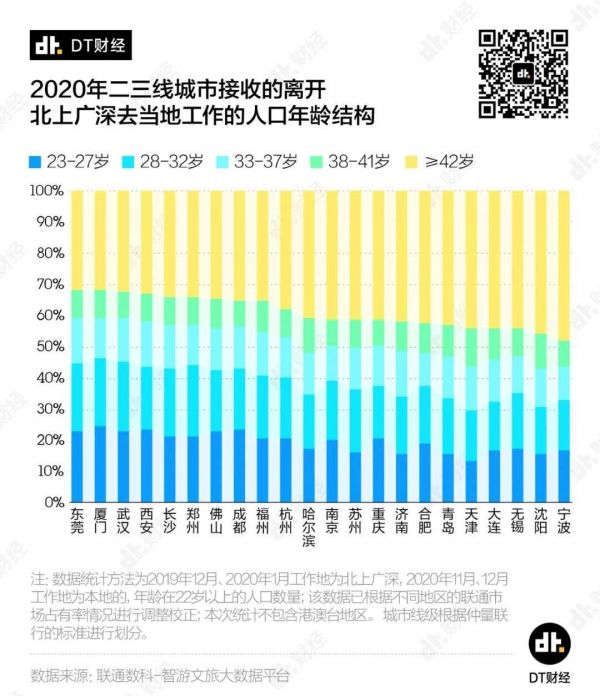 从离开一线城市到当地工作的人口年龄结构来看,东莞、厦门、武汉、西安、长沙等城市年轻吸引力强劲(吸引42岁及以上中年人口比例最低,而年龄段在23-32岁的人口占比较高)。