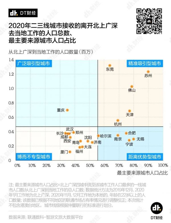 我们进一步计算了上述二三线城市流入工作人口中,最大来源一线城市的占比,以此来评估它们接收一线城市人口的集中程度;同时结合城市吸引四座一线城市来当地工作的总人口数量,得到4种不同特质的城市。