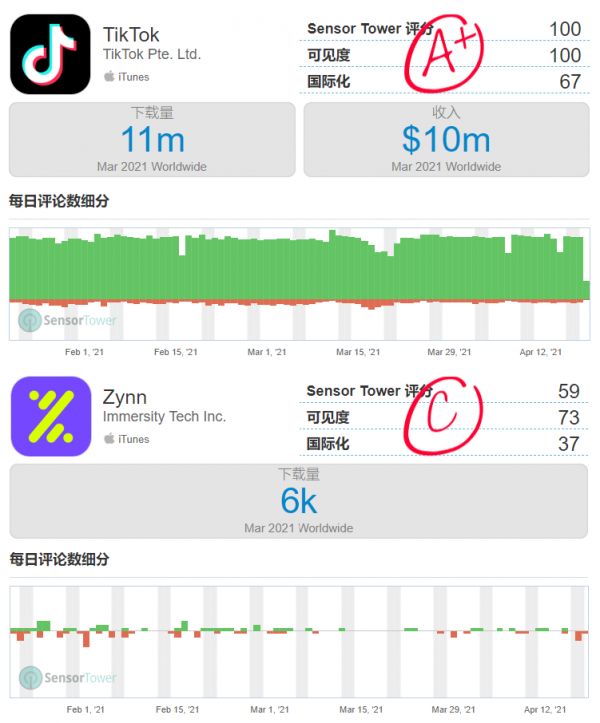 Sensor Tower商店情报平台上,TikTok(上)与Zynn(下)截止2021年3月的全球表现评分对比