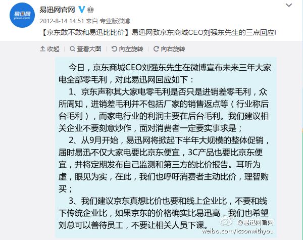 那时,易迅在物流上确实很快,从“当日送达”到“一日两送”,再到“一日三送”,易迅都走在行业的最前端。特别是2012年被腾讯收购后,易迅的步子迈得更大,建设数个大区的物流仓储基地。但实际上,公开叫板京东的易迅与京东还有很大差距,2012年,京东的销售额已突破600亿元,而据收购易迅80%股权的腾讯公布的2012年财报数据显示,腾讯电商业务营收44.28亿元,亏损3298万元。意味着,京东与易迅之间,有十余倍体量的差距。