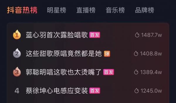 4月19日,抖音热搜榜上就出现了前四名均为音乐相关内容的情况,均由抖音内容运营团队主导。QQ音乐、网易云音乐上,醒目位置也有“抖音热曲榜”的榜单展示。