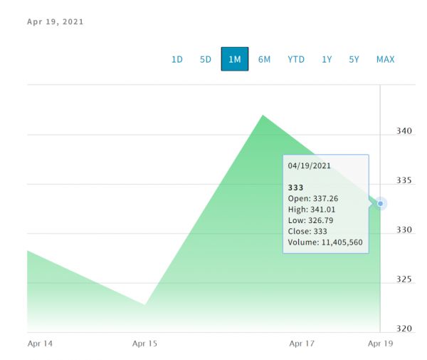 根据纳斯达克公布的IPO参考价,Coinbase每股为250美元,总市值达650亿美元。Coinbase开盘后,股价瞬间飙升超70%达到每股429美元,完全稀释后的市值 (即包括期权和受限员工持股) 一度突破了1100亿美元。不过几个小时内又马上跳水近30%,市值瞬间蒸发几百亿美元。上演了一波典型的加密货币行情。