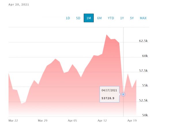 上个周末 (4月17日-18日) ,比特币突然经历了闪电式崩盘,价格跌上热搜。目前,微博#比特币跌破52000美元#话题下共有1.5亿阅读,1.4万讨论。截至发稿,比特币价格为5.6万美元,仍未升回6万美元大关。
