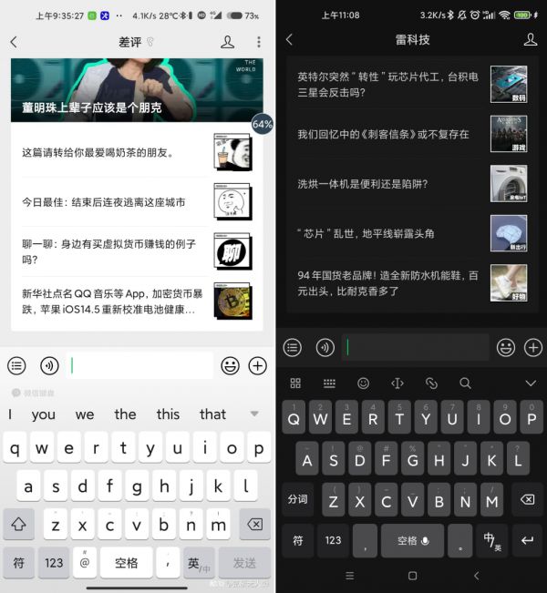 从酷安网友@弦断无人弹提供的截图来看,目前“微信键盘”的布局看上去跟传统手机输入法没什么区别,用户可以随时切换全键盘输入和九宫格输入,可谓是上手即用,几乎没有学习成本。