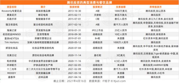 根据 IT 桔子不完全统计,腾讯目前至少参与投资了超过 15 个消费品牌,涉及鲜花、服装、餐饮、日化个护等多个领域,具体包括完美日记、MOODY、喜茶、和府捞面、海澜之家等品牌。