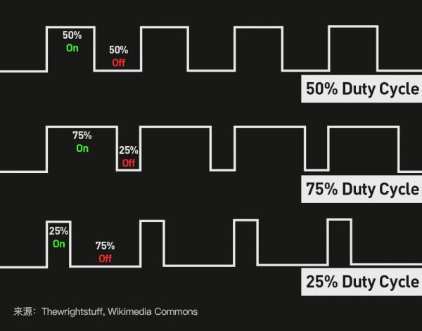此外,OLED 在低电压下不稳定,降低电压调暗屏幕会使显色失常,因此常使用 PWM 调节亮度——即让屏幕快速闪烁,通过控制明灭比值来调节亮度。