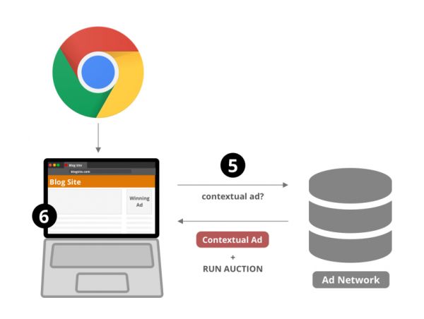 (5)在未来某个时段,该用户访问了另一个网站(blogsite.com),blogsite.com网站将会向Ad Network发出一个上下文广告请求(contextually-targeted ad),该请求包括网页URL、广告位置、广告尺寸等信息。Ad Network也会回复一个上下文广告,但与此同时Ad Network还向浏览器发送on-device竞价请求。注意,两个请求互相独立,Ad Network无法得知两者来自同一浏览器。