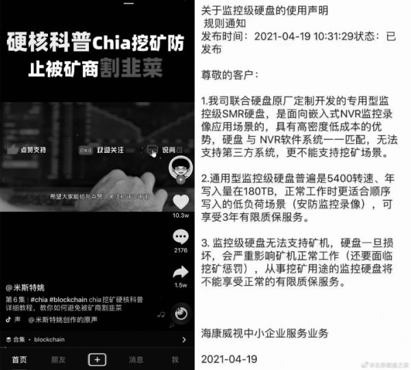 这一说法从某些层面也得到了印证,在抖音上,一个介绍 Chia 硬盘挖矿的视频,轻轻松松获得了 10 万点赞;百度指数上,Chia 的关键词搜索量自 4 月份开始突破剧烈上升;朋友圈里曾经拉人头做社区的人开始说要组团挖 Chia;就连市值 5000 亿的 A 股上市公司海康威视也发表声明,其监控级硬盘不适用于挖矿使用。