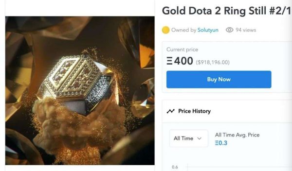 笔者在浏览某知名NFT交易平台时,发现了一款DOTA2 OG冠军戒指,售价竟然高达400ETH(以太币),也就是人民币约590万。仔细一看,出售的还并非是冠军戒指实物,只是一张动态图片而已。