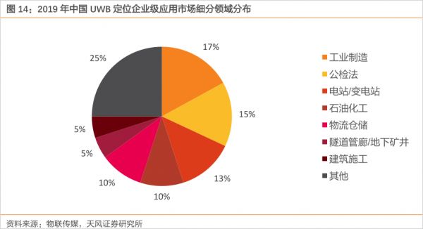 根据物联传媒数据,2019年中国UWB定位企业级应用主要分布在工业制造(25%)、公检法(15%)、电厂/变电站(13%)等领域。