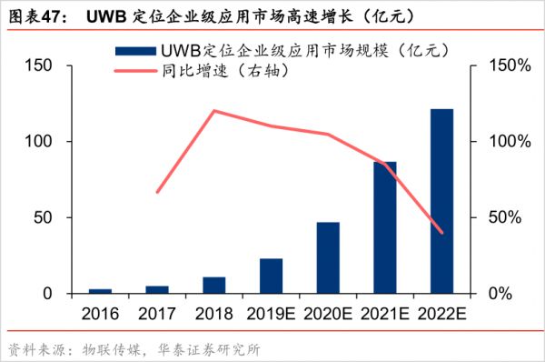 数据显示,国内UWB市场自2016年开始持续以高于40%的增长率快速成长,2018年市场规模为10.9亿元。据物联传媒数据, 预计到2022年中国企业级UWB定位市场将达到121.5亿元,对应2017-2022年CAGR达到85.6%。