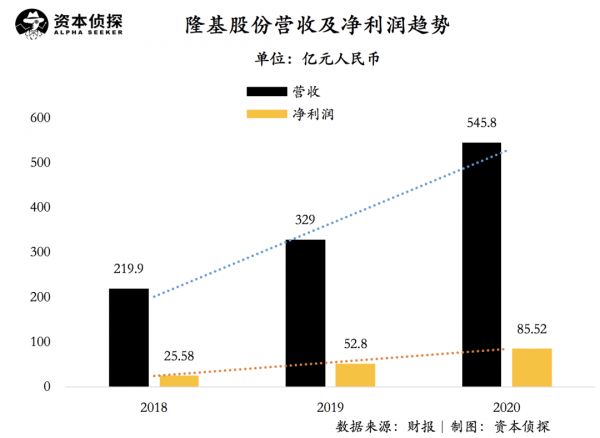 2020年,隆基股份实现营业收入545.83亿元,同比增长65.92%。归属上市公司股东的净利润为85.52亿元,同比增长61.99%。